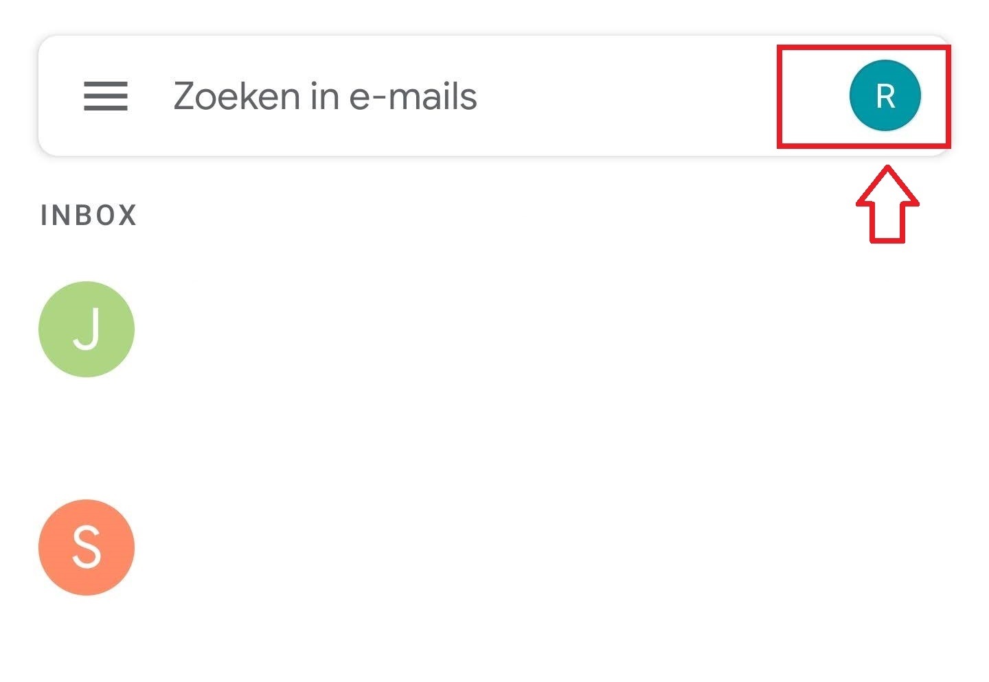 Open op uw Smartphone of Tablet de ' Gmail' app. Wanneer u de app open heeft staan, drukt u rechts bovenin op het 'icoontje' in de zoekbalk 'Zoeken in e-mails' (zie afbeelding hiernaast).