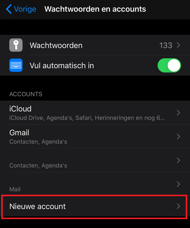 Open op uw iPhone of iPad de ' Instellingen' app. Navigeer dan naar 'Mail' En dan ziet u onder het kopje 'Mail' de knop 'Nieuwe account'.