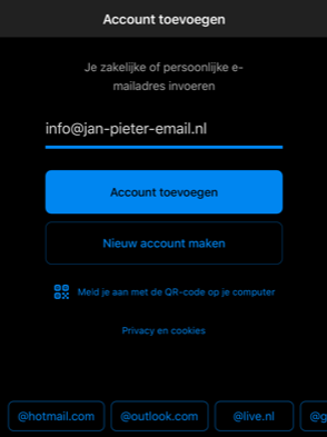 Voer het e-mail adres in dat u wenst in te stellen in het veld. Druk daarna op de knop `Account toevoegen`. Hierna dient u enkele seconden te wachten.