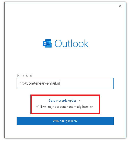 Hierna krijgt u het pop-up menu dat u hier links ziet. Onder het kopje 'E-mailadres' kunt u uw mailadres invullen. Klik hierna op 'Geavanceerde Opties' 'Ik wil mijn account handmatig instellen' 'Verbinding maken'