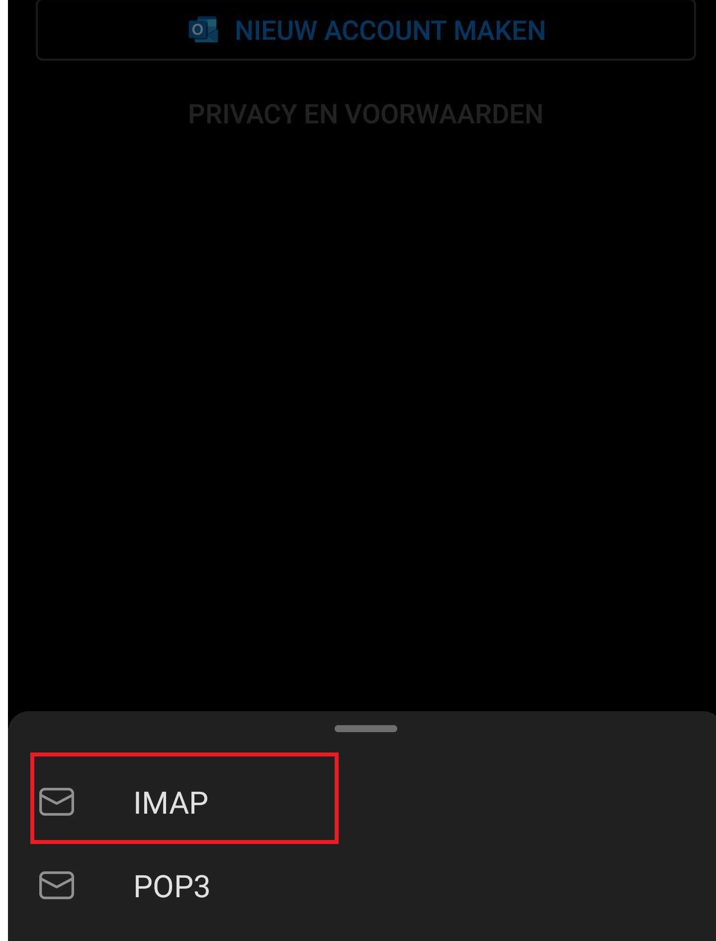 U krijgt nu een pop-up waarbij u dient te kiezen of u van `IMAP` of `POP3` gebruik wilt maken. Wij raden het gebruik van `IMAP` sterk aan.