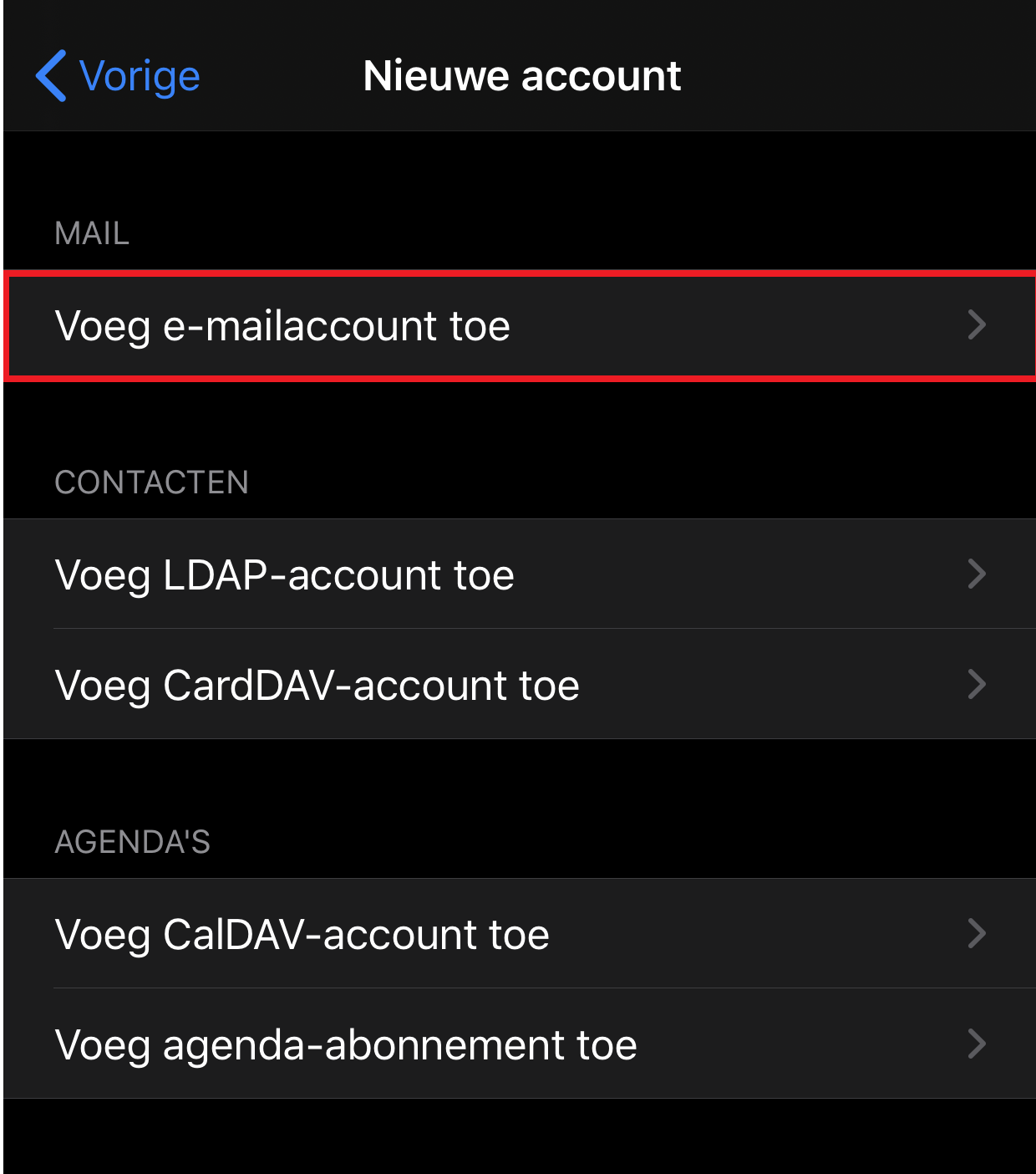 Hierna krijgt u nog een extra paar opties voor wat u wenst in te stellen, klik hier de bovenste knop/optie 'Voeg e-mailaccount toe' aan.
