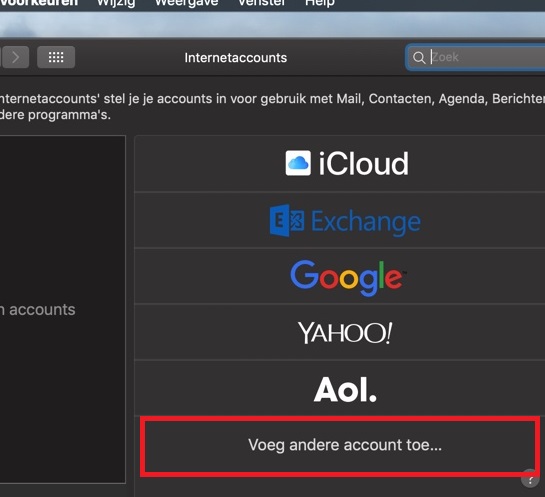 Wanneer u op de kopjes 'Mail' 'Accounts' heeft gedrukt, krijgt u het volgende overzicht met Internetaccounts naar voren. Druk hier op de knop 'Voeg andere account toe...'.