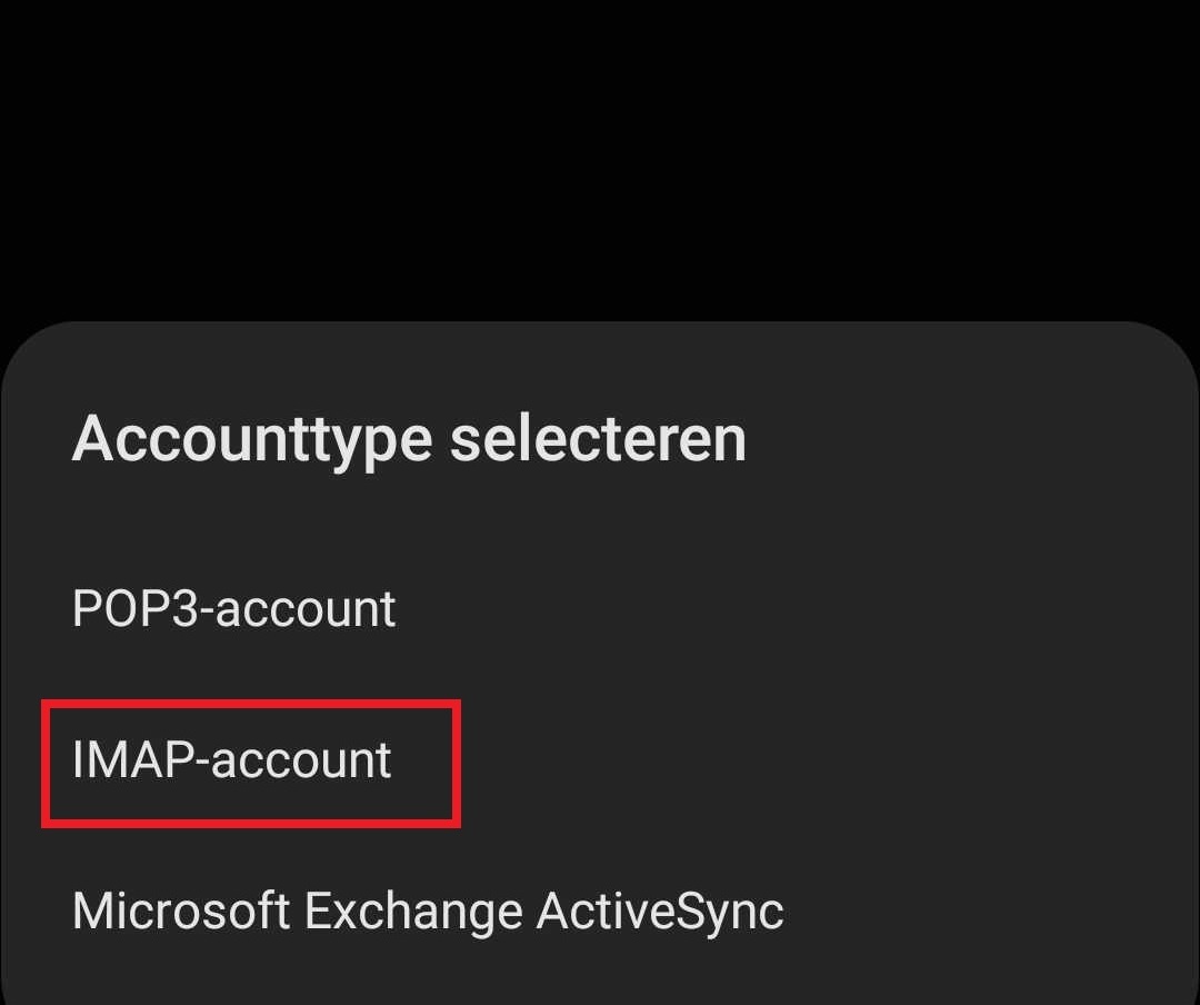 U krijgt nu een pop-up in het beeldscherm waar u een Accounttype kunt selecteren. Wij adviseren het gebruik van IMAP.