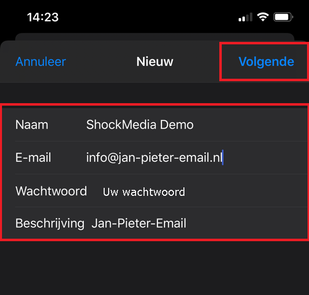 Nu krijgt u een lijst met beknopte instellingen die u dient in te vullen. Bij 'Naam' kunt u uw voornaam en achternaam invullen. Bij 'E-mail' dient u uw email adres in te vullen. Bij 'Wachtwoord' dient u uw wachtwoord in te vullen die reeds bij u bekend hoort te zijn.