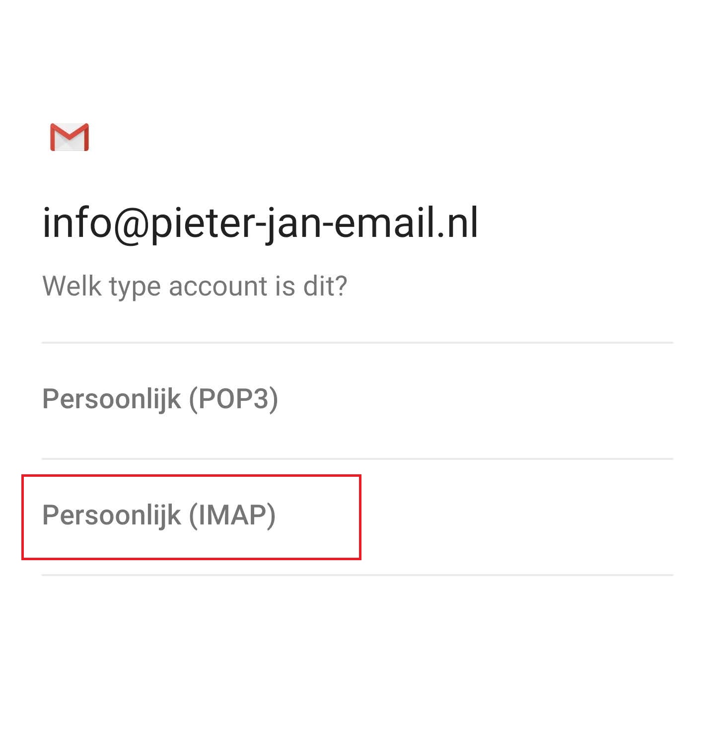 Op dit scherm dient u te kiezen of u van IMAP of POP3 gebruik wilt maken. Wij raden altijd IMAP aan, omdat de data dan zowel op uw telefoon als op de server staat.